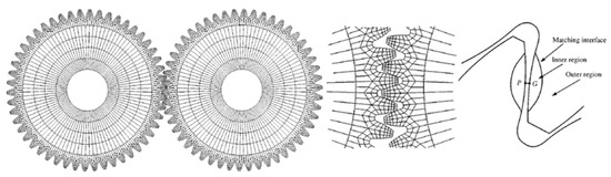 Parker and Vijayakar [65] (Figure 9) removed the need to provide the mesh stiffness as in input by coupling a FE model with a detailed analytical contact model whose results got a close agreement with experimental data on the dynamic response of spur gears and was also compared to experimental tooth root strains in [120].
