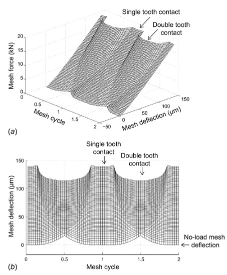 The same method was later extended to the frequency domain in [121]. This approach was even employed to applications in planetary gears [122] and experimental comparisons can be found in [123] also against simpler lumped parameters models. Further improvements to the method were introduced in [124,125,126] where the effects of compliant ring and sun gear was studied and it was shown that a higher flexibility of those components can improve the load sharing on the planets and the overall dynamic response. The effects of the presence of rolling elements was investigated in [127] using the same approach and comparing the results to those from a perturbation analysis. Improvements to reduce the computational effort were introduced in [128,129] still considering several sources of non-linearities and the influence of flexibilities and also the effects of tooth profile modifications [130]. This model was the base upon which the Hybrid Analytical–Computational model was developed in [131]. The authors precompute a Force Deflection Function (Figure 10) for various loads and apply that to a lumped parameters model obtaining extremely accurate results at a fraction of the computational time required by more complex analyses.