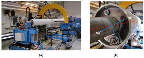 The developed unbalance analysis used the lateral displacement of the rotor center point that was measured in this test setup exploiting the four-point method [26]. This method enabled the accurate separation of roundness profile from the center point movement. The measurement was completed with four reflective laser sensors arranged at certain angles according to the method (Figure 2a).