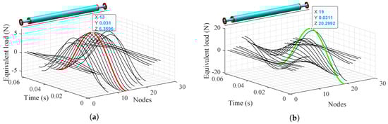 Once the unbalance location is identified correctly, the shifting and summation of all the equivalent load to the unbalance location is required [28]. This is because the paper machine’s tube roll is a continuous rotor with a relatively more even distribution of mass along its axis. Therefore, the equivalent load is spread across a few nodes instead of being isolated at the unbalance location and must be included in the calculation.