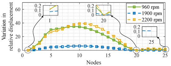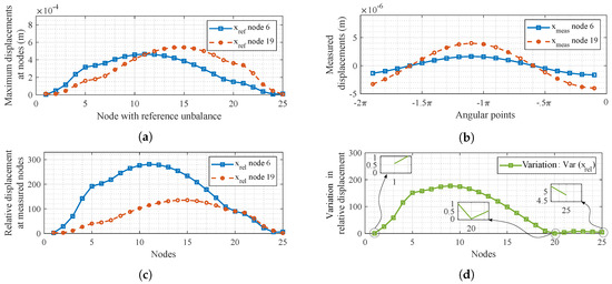 The next step compares the maximum amplitude with the known unbalance (x) obtained from the FE model to the measured maximum amplitudes (x and x). Figure 7c shows the resulting plots of relative displacements (x) when each individual x for nodes 6 and 20 are divided by their corresponding measured maximum values (x and x, respectively).
