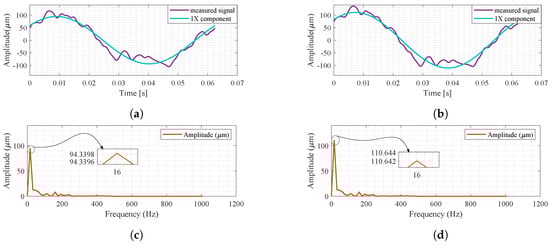 Extraction of 1X component from a measured signal using FFT. (a,c) are for the case without any additional mass and (b,d) show the process for the case with 0.056 kg·m unbalance.