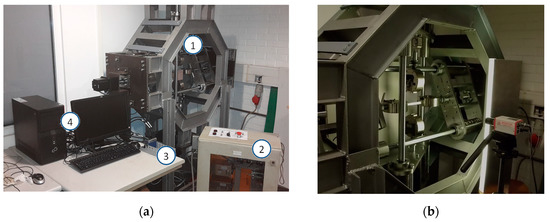 Biaxial testing machine: (a) (1) machine structure; (2) electrical panel; (3) acquisition system; and (4) computer for control; (b) Uniaxial tensile testing (horizontal axis) showing the video-extensometer system.