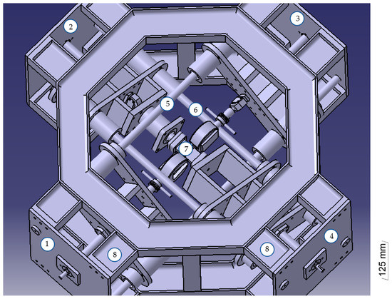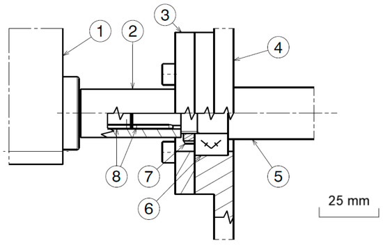 Drawing of the transmission system: (1) motor; (2) rigid coupling; (3) cover plate; (4) lateral plate; (5) spindle; (6) bearing; (7) nut; (8) keys.