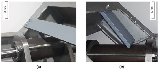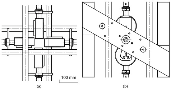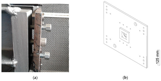 Once the specimen was sufficiently visible, it was necessary to align the lateral plates between them. However, the plates represented in Figure 3 cannot be properly aligned since they only have two points of contact with the structure. When modifying the geometry of the plates, four contact points could be obtained that allowed the adjustment in any direction. The adjustment is quite simple, using a screw to force the plate to approach the structure and two others that force it in the opposite direction, blocking it in any desired position (Figure 5a). The positions of the guides make it possible to have a field of view of the specimen of 300 × 300 mm2. The plate has a wider zone to provide space for the bearing, as well as a series of threaded holes for subsequent motor placement (Figure 5b).