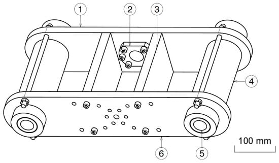 The distance between these two bars is extremely important since it is the course available, influenced by the accessories of each crosshead—e.g., having or not a load cell—resulting in crossheads with different distances between plates. This is configuration has the advantage of allowing greater distances between bearings. These plates needed to be perfectly aligned, and the whole set had to be robust. A hollow bar was used, placing the bearings inside it, and its exterior aligned and kept fixed relative to the plates. Additionally, two reinforcement plates were added to minimize the maximum deflection of the set. Figure 7 depicts the crosshead and its constituents.