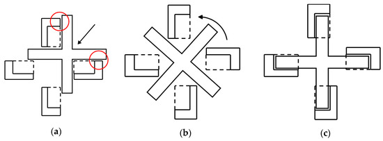 Biaxial tests are desirable for inducing plane stress. To carry out a valid plane biaxial test for a cruciform specimen, it is necessary to guarantee a uniform stress/strain state at the specimen center, which has to be fixed in space during testing, and failure has to occur in the test zone and not in the uniaxially loaded arms [14,15]. To fulfill such requirements, the influence of some parameters needs to be properly handled, such as the thickness of the biaxially loaded test zone in relation to the thickness of the uniaxially loaded arms, the radius of the corner fillet at the intersection of the arms, and the presence and dimension of slits across the arms [1,7,14,16]. Additionally, to guarantee the null displacement of the central point, it is necessary to have four movable arms, with both endpoints in the same axis moving at the same speed in opposite directions.