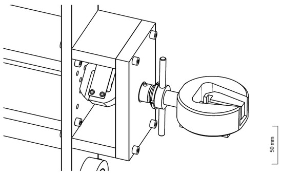 The load cells used (Section 2.2) are exclusively for compression and tensile loads. Due to the vertical arrangement of the machine, the horizontal axis load cell is subjected to a momentum caused by the weight of the grip. Thus, the cell could be loaded in a direction to which it was not designed for and this could negatively influence the results. Therefore, an additional structure was created (Figure 10), which gives side support to the load cell but still allowing movement in the horizontal direction. In this support, a PAP 3025-P10 plain bearing was used since the loads are low and the movements are reduced, resulting in minimal wear.
