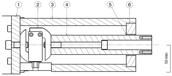 Compression configuration: (1) posterior plate; (2) load cell; (3) outer tube; (4) rod; (5) plain bearing; (6) cover plate.