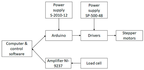 The electrical project of the machine here developed consists of a series of connected components essential for properly carrying out the experiments, such as moving the crossheads and data acquisition from the load cells. Figure 13 presents the schematics of the main electrical connections.