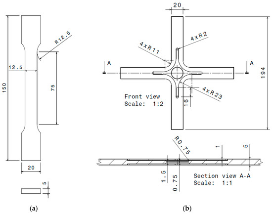 The specimens were obtained from a 5 mm PP sheet thick plate, using a bandsaw and the CNC Machining Center Mikron VCE500 (HAAS VF-0). The specimens for uniaxial tensile testing (Figure 14a) followed the guidelines of the ISO 527-2 standard [22]. The cruciform specimens (Figure 14b) resulted from a finite element based study described in [23]. These specimens have reduced thickness near the central area in order to promote failure in this region.