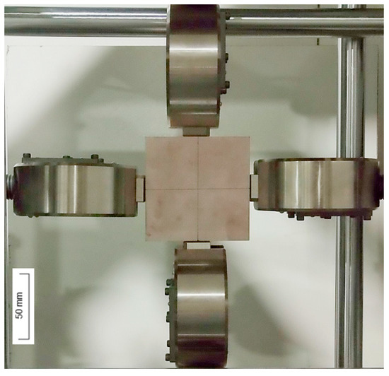 To start the experimental campaign, first, it is necessary to ensure the correct position of the grips, guaranteeing the specimen’s centering. In addition, it is necessary to mark the test pieces with the dots to be tracked by the video-extensometer. To center the grips, a block with a drawn cross was used. By placing the block supported on the lower grip, it is possible to move the crossheads individually, until all the grips align their center with the lines, thus ensuring that all grips are at the same distance and properly aligned (Figure 15). After alignment, the crossheads must always move together until the beginning of the test, maintaining the alignment and thus the symmetrical testing conditions.