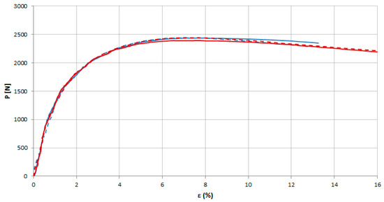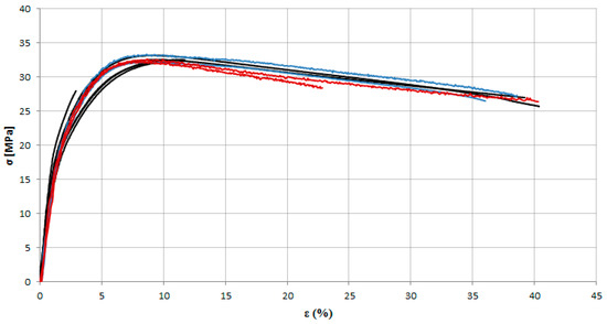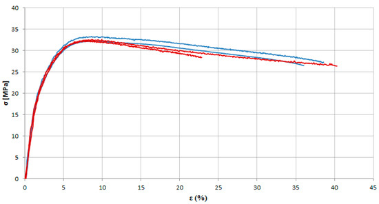 Stress–strain curves obtained from uniaxial tensile tests performed in the biaxial testing machine on MEB (horizontal axis—blue curves; vertical axis—red curves).