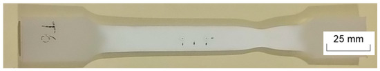 For video-extensometer analysis, 40 μm points were marked in the samples, one in the center and two equally distanced from it by 10 mm. The real distance was measured in an optical microscope—Mitutoyo TM, at a resolution of 0.001 mm—to calibrate it in the DotMeas software. Pre-loads were carefully avoided, and thus no deformation was caused to the samples during their placement in the grips. The uniaxial tensile tests were carried at a speed of 10 mm/min and the criterion used to stop testing was necking observation. Four tests were carried out, two per each axis.