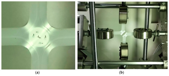 Two pairs of 5 kN wedge grips from Shimadzu were employed. To make the positioning of cruciform specimens easier, an unusual configuration was adopted. By rotating the grips, the openings are on opposite sides, but the specimen can be placed by rotation of the straps (Figure 9).