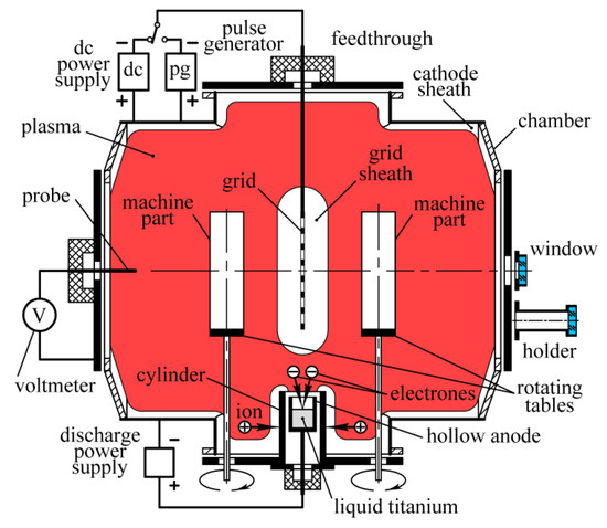 Ion-plasma processing of engineering products allows purposeful modification of their surface properties. Using sources of metal plasma [1] or metal vapor [2] allows the synthesis of wear-resistant coatings of carbides and nitrides of titanium, chromium, and other metals on the products. Using the method of plasma immersion ion implantation [3,4], any materials can be modified, and alloying additives can be introduced into the surface layer. Ion-plasma treatment reduces the coefficient of friction, increases the useful life of the products, and significantly increases their wear resistance and corrosion resistance. It also allows for combined treatment; for example, ion nitriding of steel products with the subsequent deposition of wear-resistant coatings [5]. In the latter case, a hardened surface layer with a thickness of 50–100 μm prevents brittle fracture of hard coatings with thickness not exceeding 5 μm. This improves the adhesion of the coating and its resistance to cracking. As a result, the product combines wear resistance with high load-bearing capacity and good fatigue strength. In plasma-immersion ion implantation, the product is immersed in a plasma containing the necessary ions, and negative high-voltage pulses are applied to it [3]. The thickness of the modified material layer is determined by the depth of ions’ penetration, which is proportional to their energy. To reach the maximum possible values of the ion energy and modification depth for a given voltage, the ions must pass through the space charge sheath between the plasma and the product surface without collisions with gas molecules. At a pressure p = 1 Pa, the mean free path of nitrogen molecules and ions is λ ≈ 6 mm, and the space charge layer width at a voltage of ~100 kV can reach d ≈ 600 mm. Therefore, the gas pressure in the working vacuum chamber should not exceed 0.01 Pa.