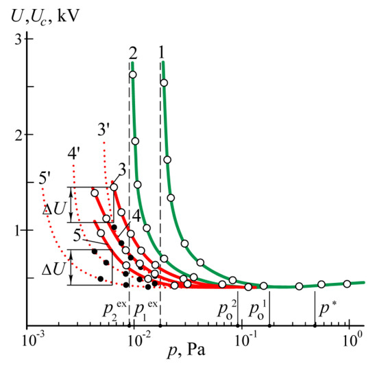 When an anode disk with a diameter of 15 cm is installed in the chamber, the effective area of the anode is equal to Sa ≈ 320 cm2. Turning on the discharge power source at an argon pressure in the chamber p = 1 Pa leads to filling the chamber with a uniform plasma glow of the discharge with a voltage of U = 440 V at a current of I = 1 A. When the argon pressure decreases from p = 1 Pa to p * = 0.5 Pa, the cathode fall Uc, equal to the potential difference between the probe and the chamber, decreases from 440 V to a minimal value of 410 V and retains this value until p reaches the value po1 = 0.19 Pa and begins to increase with a further decrease in pressure (solid curve 1 in Figure 2).