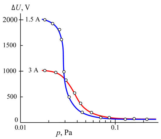 With the anode disk diameter of 8 cm, the anode area Sa ≈ 80 cm2, and with decreasing pressure Uc begins to grow at p = 0.045 Pa (dotted curve 3′ in Figure 2). With a diameter of 6 cm, the anode area Sa ≈ 40 cm2 and Uc begins to grow at p = 0.022 Pa (dotted curve 4′). At a diameter of 5 cm, the anode area Sa ≈ 20 cm2 and Uc begins to grow at p = 0.011 Pa (dotted curve 5′). Comparing the dotted curves 3′, 4′, and 5′ of the cathode fall of the potential Uc with the solid curves 4, 5, and 6 of the discharge voltage U reveals a positive anode fall of potential ΔU equal to the potential difference between the anode and the plasma probe U–Uc.