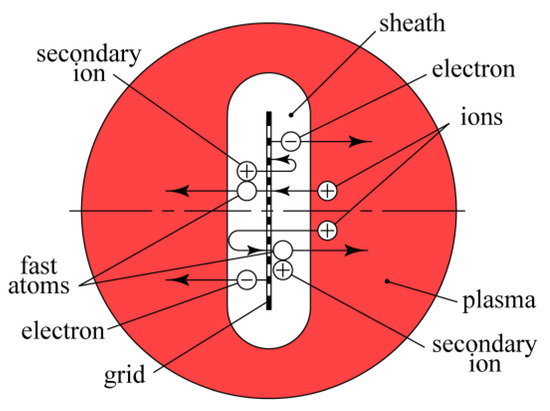 Ions accelerated in the sheath of the positive space charge surrounding the grid pass through its holes and are decelerated on the other side of the grid. Then they are accelerated back to the grid, pass through its holes again, and so on (Figure 4). The average path of ions repeatedly flying through the holes of the grid is equal to