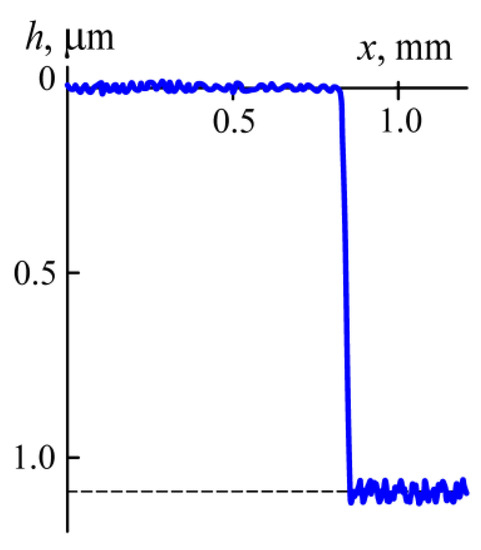 When nitrogen was supplied to the chamber instead of argon, heating of the cylinders to 500 °C at p ~ 0.1 Pa was followed by the coating deposition at p = 0.02 Pa. After a 2-h-long etching, the polished plate at an argon pressure of p = 1 Pa, Id = 3 A, and U = 5 kV, the masks were removed from its surface. The height h of the between steps covered by the masks and open surfaces of the plate was measured (Figure 5). For the center of the plate, it amounts to h = 1.2 μm, thus indicating that the sputtering rate is equal to v = 0.6 μm/h.