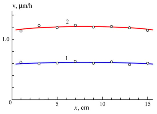 The etching rate v versus the distance x from the table at p = 0.1 (1) and 1 (2) Pa.