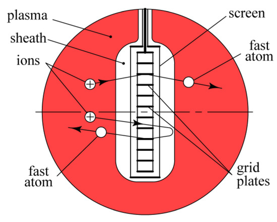 At a low pressure of p < 0.1 Pa, application to a conductive product of high-voltage pulses allows the implantation into its surface layer of any alloying additions and modification of its structure [28,29,30]. Because of the inhomogeneity of the ion current density on the surface of a complex-shaped product, the implantation dose distribution should be also inhomogeneous. When high-voltage pulses are applied to a grid composed of plane-parallel plates (Figure 7), pulsed beams of fast neutral atoms with a uniform distribution of flow density are generated. Rotation of the machine parts under processing by homogeneous beams ensures the homogeneity of the implantation dose distribution. It should be also mentioned that the experimental setup presented in Figure 1 could be also used for the implantation of fast neutral atoms into any dielectric products.