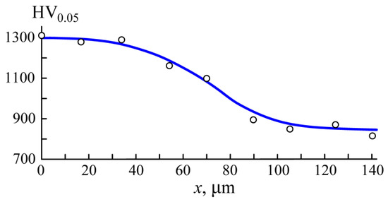 Dependence of the microhardness HV0.05 on the distance x from the sample surface.