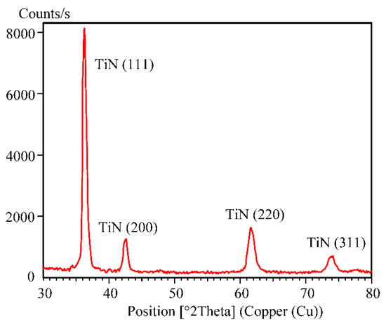 After the fast atoms started to mix the atoms in the surface layers of the plates, the gas pressure was diminished to p = 0.02 Pa. As a result, titanium evaporation in the hollow anode and synthesis of titanium nitride coating on the rotating plates started. An hour later, the titanium nitride coatings were synthesized on the plates. Figure 9 presents an X-ray diffraction pattern of the coating obtained using the PANalytical Empyrean Series 2 X-ray diffractometer with monochromatic CuKα radiation in asymmetric geometry. The radius of the high-resolution goniometer was equal to 240 mm. Measurements were carried out in the range from 10 to 100 degrees with a resolution of 0.0001 degrees.