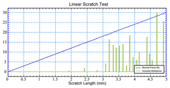 The coating thickness was defined after removing the masks from the plate surface and measuring the height of the steps between covered with masks and the open surface of the plate. The thickness monotonically decreases from 3.2 μm near the lower end of the plate to 2.8 μm near its upper end. The X-ray diffraction pattern of 3.2-μm-thick coating does not differ from that of 2.8-μm-thick coating. This means that the coating composition does not change with the distance from the source of titanium vapor. Presented in Figure 10, the dependence of the normal force and acoustic emission on the scratch length obtained using a Nanovea M1 Hardness and Scratch Tester produced by Nanovea Mechanical Testing (Nanovea INC, Irvine, CA, USA) reveals an acceptable adhesion of the TiN coating to the plate. For the scratch test, a conical diamond indenter with a tip radius of 100 μm was used. The applied load on the indenter was up to 30 N. The scratch length was equal to 5 mm.