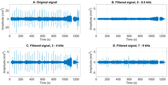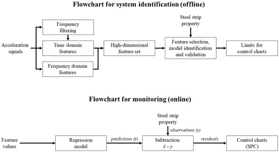 21]. Before extracting these time domain features, the complete signals are also filtered by using various frequency bands with different sizes. Furthermore, the amplitudes of individual frequency components are computed, and statistical features are extracted from them in the successive time windows. The use of narrow frequency bands and individual frequency components could reveal effects masked behind other full or wide bandwidth effects and disturbances, which can be intensive in industrial surroundings. The flowchart for system identification in