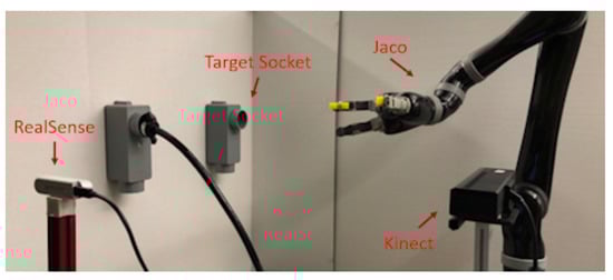 A benchmarking setup is used in this study shown in Figure 1. The setup consists of a power cable (Deka Wire DW04914-1) with a plug (Optronics A7WCB) on the tip, two power sockets (McMaster-Carr 7905k35) attached on the wall, two neodymium disk magnets (DIYMAG HLMAG03) glued to the socket and the plug to provide a suction force []. Our system also includes a 6-DOF JACO v2 arm with three fingers, and two RGB-D cameras, i.e., Realsense D435 and Microsoft Kinect. The Realsense camera is used to estimate and model the shape of the cable, while the Kinect camera is used to estimate the socket pose and filter the point cloud. This scenario corresponds to a humanoid robot equipped with a depth camera at its left arm wrist and another depth camera at its head. One arm performing the task while the other is providing the perception feedback.