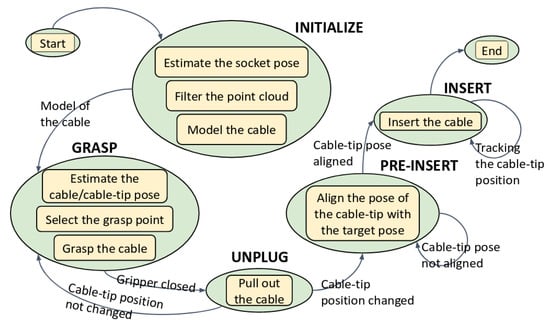 From a system design perspective, to complete the DRC Plug Task autonomously, the system needs to be able to model a linear flexible object, to keep track of the cable configurations and to detect the pose of the target socket through pose estimation, to plan motions for the robot, and to align the cable tip with the target socket by a controller. A flow of the proposed system architecture is presented in Figure 2.