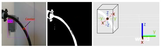 It is challenging to find specific irregular objects in a noisy environment. In this task, a real-time object detection method called YOLO [] is used for detecting the flexible power cable in the 2D images (Figure 3(left)). The process requires training a convolutional neural network (CNN) with self-labeled images. We trained the network for 40,000 steps with 100 labeled images. The output of YOLO is a bounding box that narrows the region down to a search for the cable. To get the pixels corresponding to the object, we then use the color information and detect the black pixels in this region (Figure 3(middle)). These pixels are stored in a set in the order from top to bottom and left to right, and we define the middle pixel as the center pixel of the object which is marked as “Center” in Figure 3(left). By integrating the depth information, we can get the 3D positions of the object center. A PassThrough filter from the point cloud library (pcl) [] was used to filter the point cloud from three dimensions as shown in Figure 3(right). The point cloud in the narrowed bounding box served to model the cable. It is published through ROS at a frequency of 30 Hz.