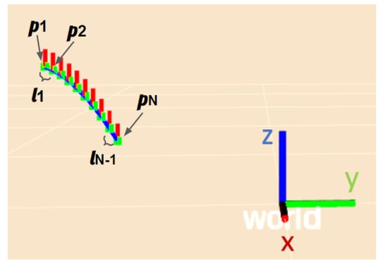 Figure 4 shows an example of modeling result with 10 sample points. The power cable is visualized in Rviz by markers. Green markers represent the sampling points, consecutive points are connected by blue lines, and vertical upward red lines are used to illustrate the displacements between the points.