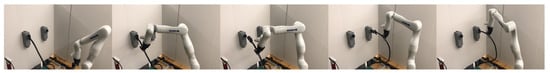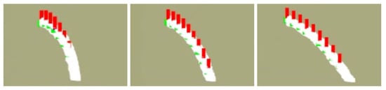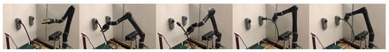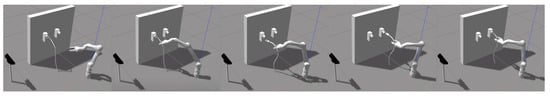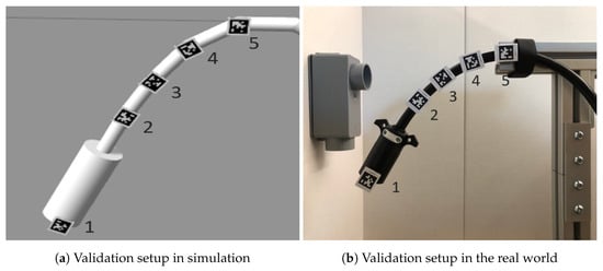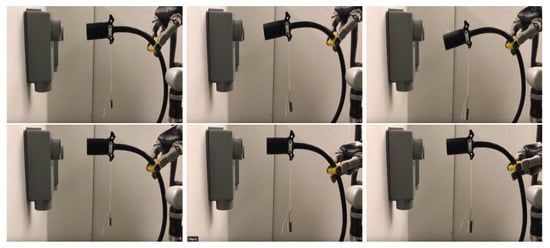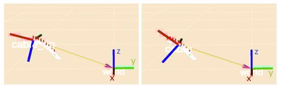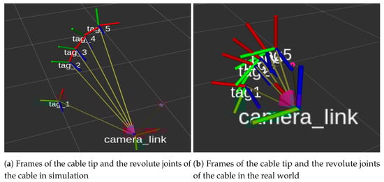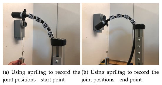Recalling that each joint of the cable has roll and pitch rotations (see Figure 8), we simplify the model by only considering the pitch. Our first challenge is to get the joint values. AprilTag [] is used for getting the joint positions. Figure 12 shows the start and end points of recording the joint positions with a 100 g weight added to the tip. Four apriltags with side lengths of 2.0 cm [] are attached on the cable 5 cm apart (same as the link length in Gazebo). The joint position and the time stamp are recorded for calculating joint velocity and acceleration . After we get joint values, the robot Jacobian J can be calculated. Because the joints on the cable are passive, equals to . The external force is also known by multiplying the mass of the weight (0.1 kg) with the gravitational acceleration (9.8 m/s).