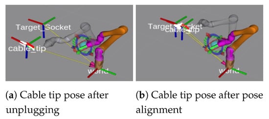 The grasp point needs to be selected such that for the robot to be able to align the cable tip pose with the target pose. By using the same method of estimating the “cable_tip” frame, we can get the “cable” frame (Figure 5(right)), which is used to get the grasp pose of the robot’s end-effector. The grasp pose is then used as the target of the motion planner. We implemented both MoveIt! [] and TrajOpt [] for the motion planing in this task.