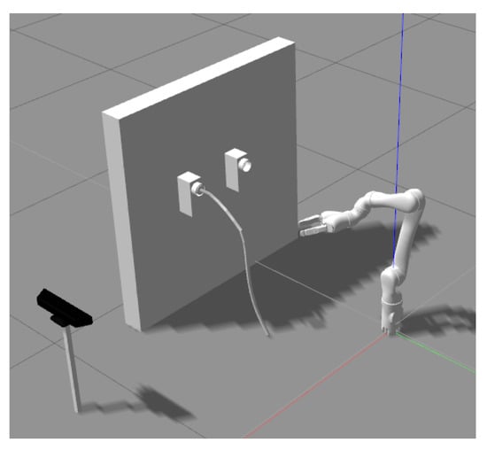 The simulation setup consists of a wall, two power sockets, a power cable with a plug, a Kinova Jaco V2 robotic arm, and a Kinect camera. Figure 7 shows the simulation setup in the Gazebo simulator []. Modeling of rigid objects in the simulator is a solved problem: The wall can be modeled as a box and the plug can be fitted as a cylinder. Modeling objects of irregular shape is relatively difficult, but we can get the model in a solid modeling computer-aided design tool (e.g., SolidWorks) and then use a converter (e.g., SolidWorks to URDF Exporter) to get the model in the desired format. The RGB-D camera in the simulated environment is a Kinect camera. To read the point cloud information, we need to model the Kinect camera as a Depth Camera Plugin in Gazebo. The simulated Jaco arm is cloned from the official Kinova GitHub website. In simulation, we assume that the positions of the sockets are known. Modeling of the cable in the simulator is a challenge and it will be introduced in the next subsection.