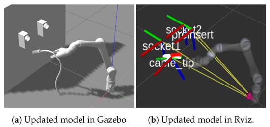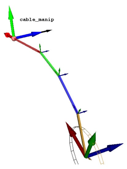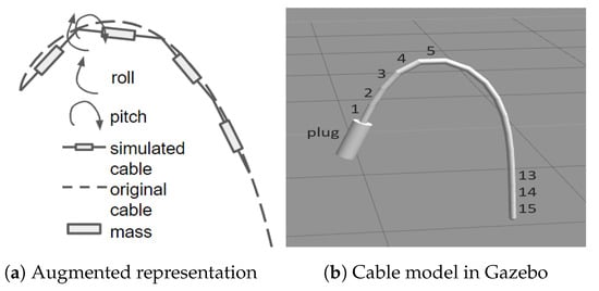 Inspired by the “fire hose” model in Gazebo and the Piecewise Constant Curvature (PCC) model [], a Dynamically-Consistent Augmented Formulation [] of the PCC cable model is created in Figure 8a. A Gazebo model of the cable is also built based on the PCC model (see Figure 8b). Fifteen links are used to model the cable, each link is 5 cm long and weighs 50 g with the center of mass in the middle of the arc. The plug is also a link with length 10 cm and weight 100 g. These links are connected by revolute joints (except the joint between the plug and link-1) with the roll and pitch rotations. Each joint has stiffness and damping properties. There exists a trade-off in selecting the number of links for the simulated cable. In theory, more links of the cable model will produce more accurate simulation results. On the other hand, more links will cause the computing speed to slow down or even the simulator to crash. We observed that if the number of links is increased to twenty, sometimes there exists a misalignment between the links.