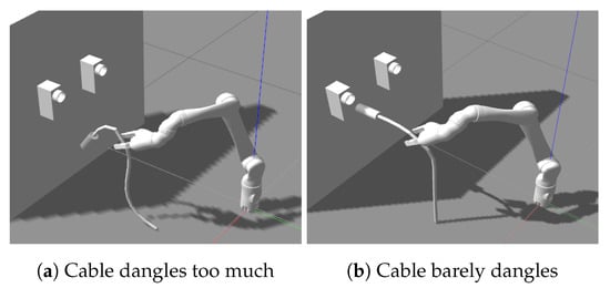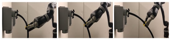 Manipulation of linear flexible objects is of great interest in many applications including service, manufacturing, health, and disaster response. Indeed, the topic has been the focus of many research studies in recent years. Cables, ropes, clothes, organs, and strings are common deformable objects used in deformable object manipulation [,,,,,]. Cables are linear flexible objects that are common both in industrial and domestic environments. Popular tasks about linear flexible object manipulation include tying a knot using a rope [], inserting a string to a hole [], untangling a rope tie [], predicting and controlling the shape of the cable [,].