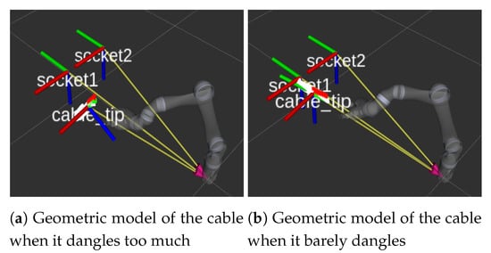Unplugging the cable from the socket is straightforward with a backward panning motion for the end-effector. After the cable being plugged out of the socket, the weight of the front section (plug) of the cable will cause the cable to dangle. In our model (see Figure 8), this deformation depends on the joint stiffness and damping. We observe that the deformation of the cable is different by randomly setting the values for the joint stiffness and damping. Two special cases are: (1) The cable dangles too much (see Figure 10a); (2) the cable barely dangles (see Figure 10b). However, our geometric model works well in both cases (see Figure 11). To get reasonable values for the joint stiffness and damping and to narrow the gap between simulation and real world, we need to collect data from the real world and go back to simulation to update the models and methods. To automate the Plug Task, we need to figure out how to carry the cable to the Pre-insert position after the cable being Unplugged from the original socket. We use the visual servoing approach mentioned in Section 2.3 to reduce the differences between the “cable_tip” frame and the Pre-insert frame. After the cable tip moves to the Pre-insert position, a forward panning motion for the end-effector will Insert the cable tip (plug) to the target socket.