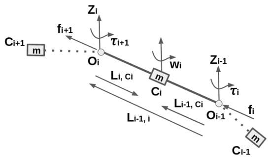 Computing of the left three terms () in Equation (9) is our second challenge. We refer to the Recursive Newton Euler (RNE) approach [,,]. The RNE approach includes two recursions: Forward recursion for computing velocities and accelerations, and backward recursion for computing forces and torques. Figure 13 shows the parameters of three adjacent links and Algorithm 2 shows the detailed RNE algorithm. The RNE algorithm gives us the torque required for each joint to overcome the gravity of the model and the force generated from the motion if the cable joints have no friction or damping and there is no external force. The left three terms () in Equation (9) can be represented as: