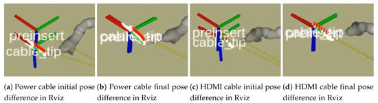 The second experiment shows the performance of the pose alignment controller with two different cables. Due to the limitation of point cloud publishing frequency (30 Hz), we set the constraints for linear and angular velocities in the Cartesian space as 1.5 m/s and 0.6 rad/s to prevent the substantial deformation of the cable in the interval of the point cloud update. We implement the pose alignment controller with two different cables (10 trials/each). Figure 21 shows two successful runs during these experiments. Figure 22 shows the pose differences between the cable tip frame and the pre-insert frame. Our pose adjustment control loop ends when the pose differences meet the thresholds which is 0.01 m for translational terms and 0.02 rad for rotational terms. In this experiment, we conclude that the HDMI cable (average elapsed time: 12.26 s) needs more time than the power cable (average elapsed time: 5.59 s) to adjust the pose. A potential reason might be that the HDMI cable has more deformation than the power cable.