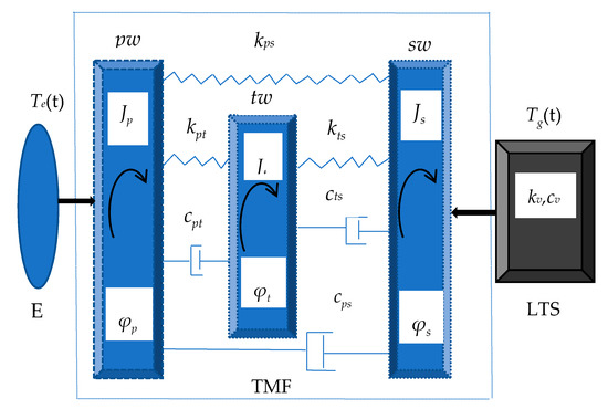 Note that the considered TMF inherently comprises five different concepts of torsional vibration absorbers. The first concept is depicted in Figure 1 and corresponds to the case when all three flywheels are interconnected via stiffness and damping components. This concept of the absorber will be termed as psptsTMF. When the tertiary flywheel is not connected to the secondary flywheel, that is, for , Figure 1 presents the concept of the absorber termed as psptTMF. In the case when the tertiary flywheel is not connected to the primary flywheel, that is, for , Figure 1 presents the third concept of the absorber-pstsTMF. If there is no coupling between the primary and secondary flywheels, that is, for , Figure 1 will represent the fourth concept of the absorber termed ptsTMF. Finally, if the tertiary flywheel is absent, then the absorber becomes a conventional DMF and Equations (1), together with the first expression in Equation (2), and conditions of