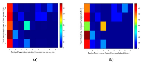 The solutions of problem GSA obtained for the psptsTMF in the case of low and high levels of mean value of engine driving torque in the operation engine speed range are shown in Figure 2a,b. The solution is presented by means of mapping between the design parameters and the values of the total sensitivity indices of the objective functions (8)–(10).