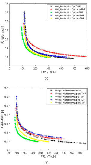 The red curves in Figure 3a,b correspond to the results of weight-vibration bi-objective optimization of the TMF with respect to all design parameters Equation (15). The green curves are the Pareto fronts of optimization of the TMF in the case of . The black curves correspond to the results of optimization for the drivetrain equipped with the DMF, that is, to the solution of problem WV-PO when the structure of the TMF satisfies the conditions Equation (3). The blue curves are the Pareto fronts obtained in case when the tertiary flywheel is connected only to the secondary flywheel. The yellow curves represent the results of weight-vibration bi-objective optimization of the TMF with tertiary flywheel connected only to the primary flywheel.
