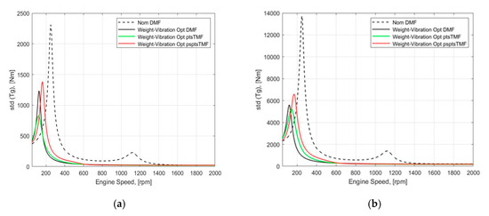 The standard deviation of the torques at the transmission input shaft as a function of the engine speed in the range of are depicted in Figure 4a,b for the DMF with nominal design parameters (12) (dashed curve), and for the weight-vibration optimized DMF (solid black curve), the ptsTMF (green curve), and the psptsTMF (red curve). Zoomed plots of these curves are presented in Figure 5a,b, respectively.
