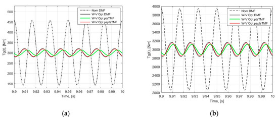 Figure 6a,b present the time history of the torques at the transmission input shaft in the drivetrain system for operating engine speed , illustrating how much the weight-vibration optimized DMF (solid black curve), the ptsTMF (green curve), and the psptsTMF (red curve) enhance the attenuation of the torque oscillations in comparison with the DMF with nominal design parameters (12) (dashed curve).