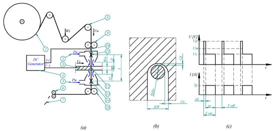 The schematic diagram of the device is shown in Figure 1a. The wire moving in the material cuts the kerf larger than the its diameter; the scheme of this process is shown in Figure 1b. The difference between of the kerf width and the wire diameter is called spark gap, and it depends on the process parameters. Sparkling is caused by the generator, which creates electrical impulses that is shown schematically in Figure 1c. The effectiveness of a single discharge can be determined by an empirical equation [17,18].