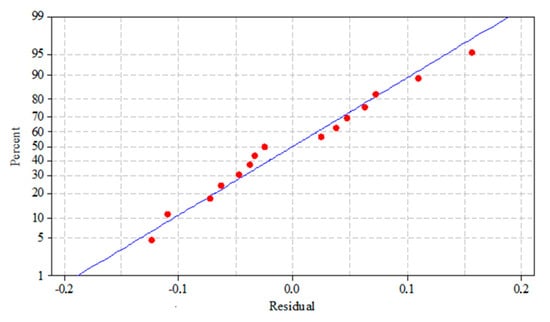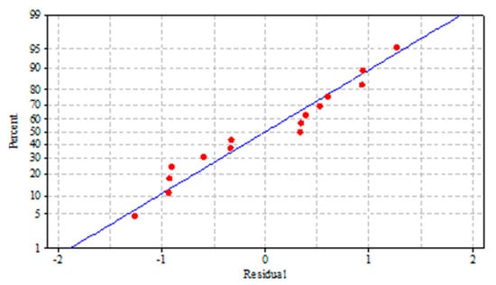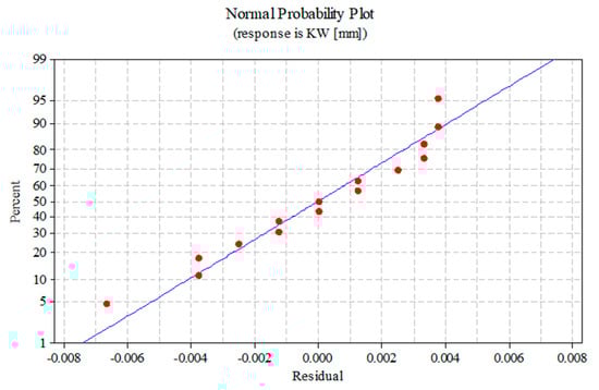 The results of respective ANOVA test presented in Table 8 show the significance of the regression model for KW (obtained p-value < 0.05), as well as its adequacy, since the respective requirement of the F-test is met (calculated F-ratio equal to 24.85, significantly exceeds its tabulated value), all at 95% confidence level. It is also to be noted that p-value for “Lack of Fit” of 0.615 implies the non-significance of the source element, as desirable. Normal probability plot of the residuals for the KW process response is presented in Figure 5. The regularities in distribution of the residuals observed in the graph confirm that the performed analysis could be validated.