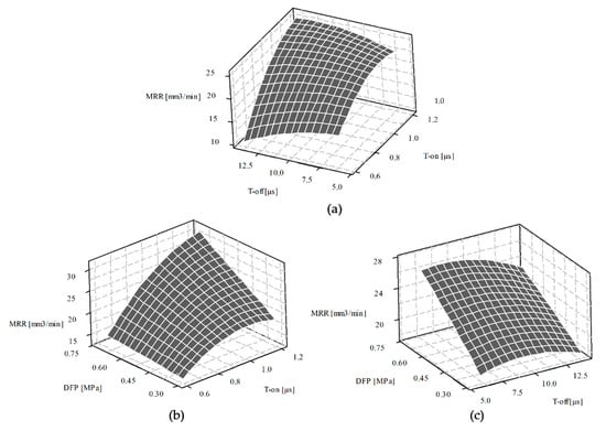 Response surface 3D plots representing the MRR dependence on: (a) T-on and T-off, for DFP = 0.5 MPa; (b) T-on and DFP, for T-off = 10 µs; (c) T-off and DFP, for T-on = 0.9 µs.